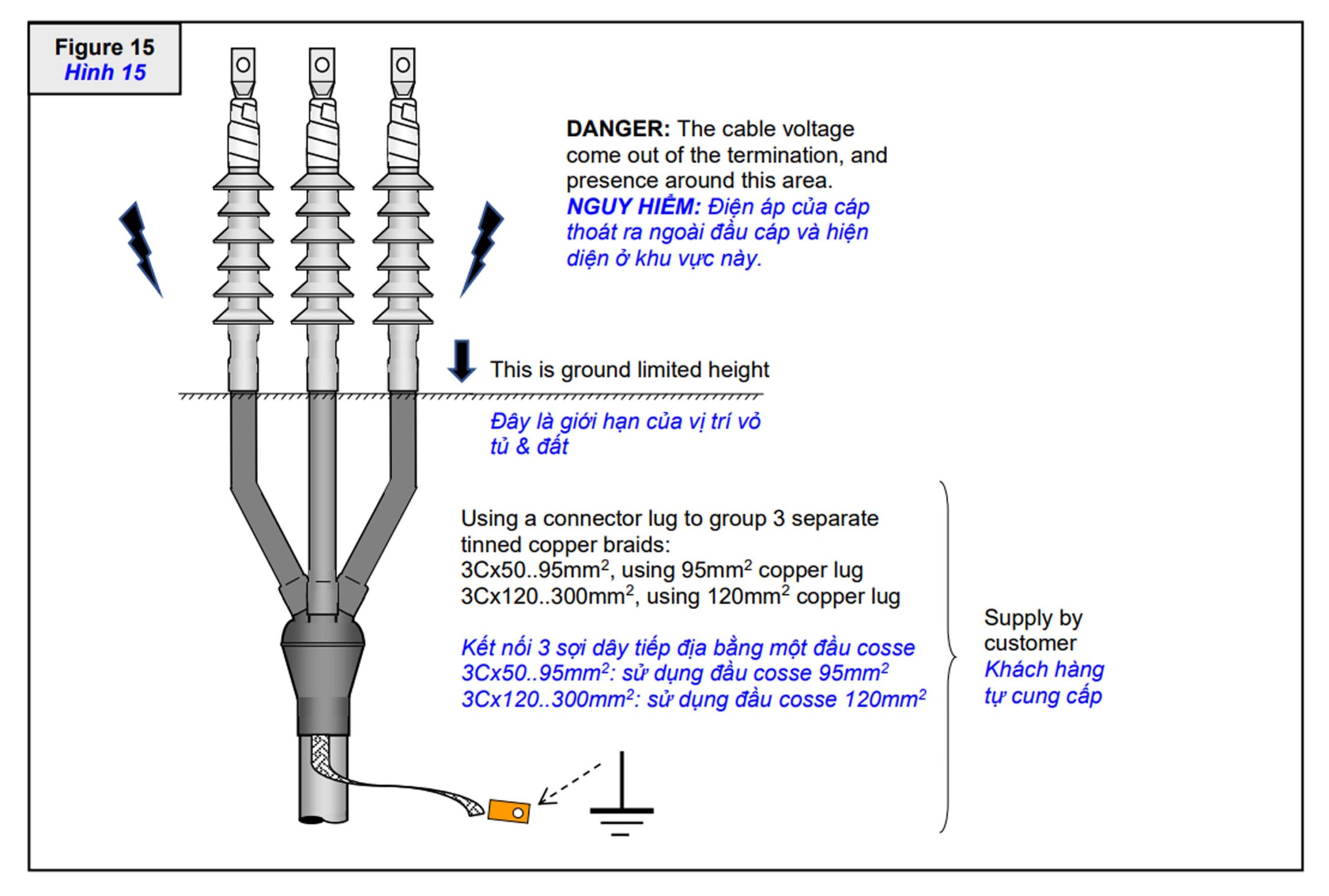 Bước 3:  Đặc biệt – đối với những đầu lug lớn không thể luồn ống đầu cáp QTII đi qua, thì luồn ống đầu cáp QTII vào các pha cáp trước khi lắp đặt lug, định hướng ống QTII với đầu dây rút tự do hướng về đầu lug (xem hình 15 nếu cần thiết). Sau đó tiến hành lắp đặt lug.