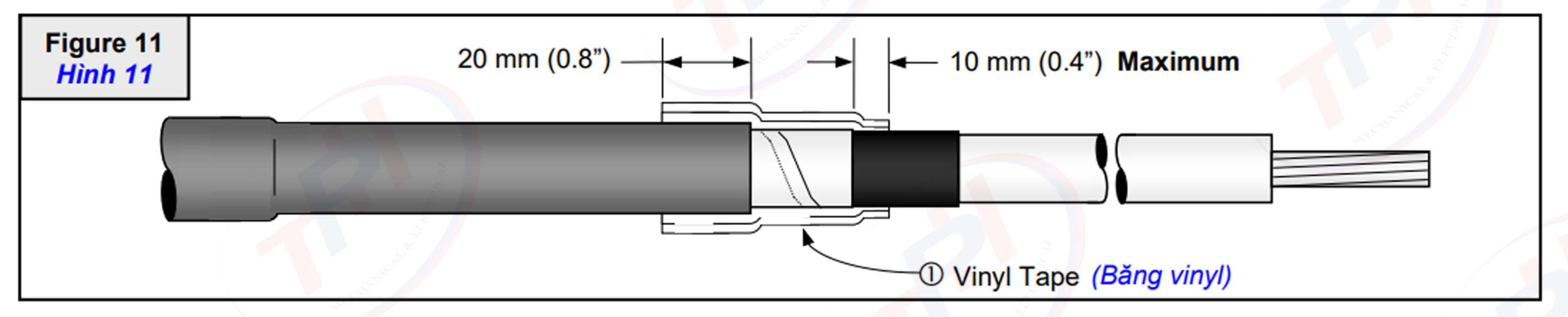 Bước 1:  Quấn hai lớp băng vinyl chồng nửa để giữ chặt ống nối vỏ cáp và lớp băng đồng của cáp (“1” hình 11). Bắt đầu quấn trên ống nối vỏ cáp từ vị trí cách mép cắt 20mm (0.8”) quấn lấn phủ qua 10mm (0.4”) lên lớp bán dẫn của cáp và quay trở lại vị trí ban đầu.