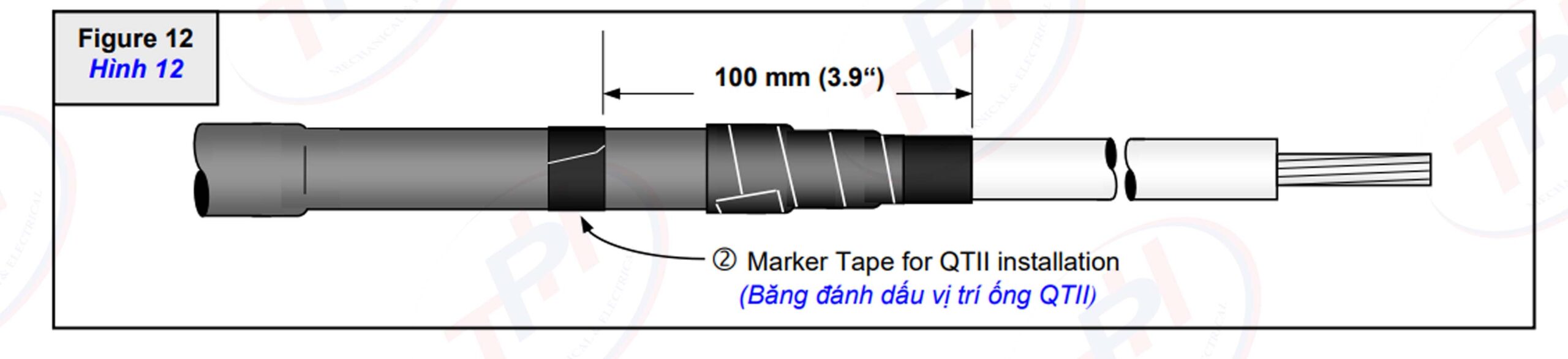 Bước 2:  Quấn một lớp băng đánh dấu vị trí lắp đặt ống QTII lên ống nối vỏ cáp cách mép lớp bán dẫn 100mm (3.9”) (“2” Hình 12). Băng đánh dấu này cực kỳ quan trọng trong việc thi công đầu cáp QTII.