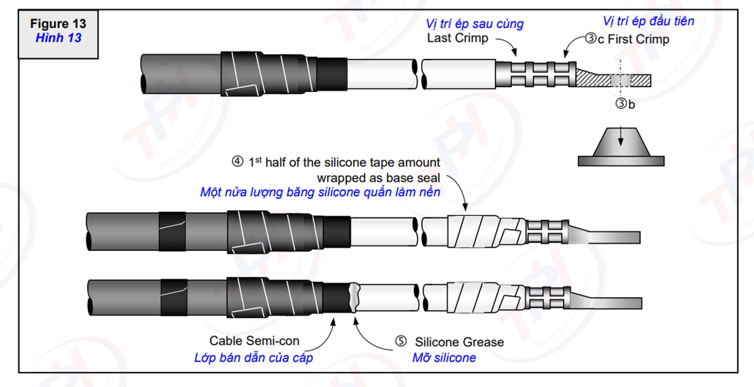 c,  Ép đầu lug theo các khuyến cáo của nhà sản xuất. Bắt đầu ép tại vị trí gần lỗ xuyên bulon bắt vào đầu cực thiết bị (“3c” Figure 13). Lau chùi mỡ bảo quản nếu bị xì ra trong lúc ép đầu lug.