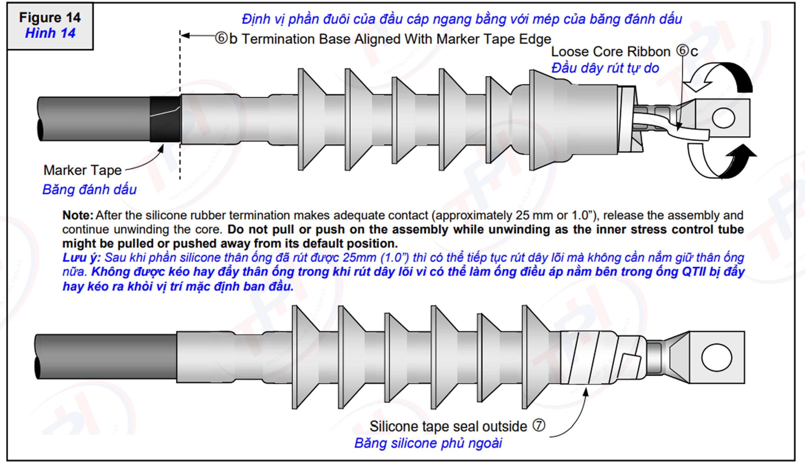 b,  Định vị phần đuôi silicone của đầu cáp (không phải phần lõi plastic) ngang bằng với mép của băng đánh dấu như hình vẽ (“6b” Hình 14).